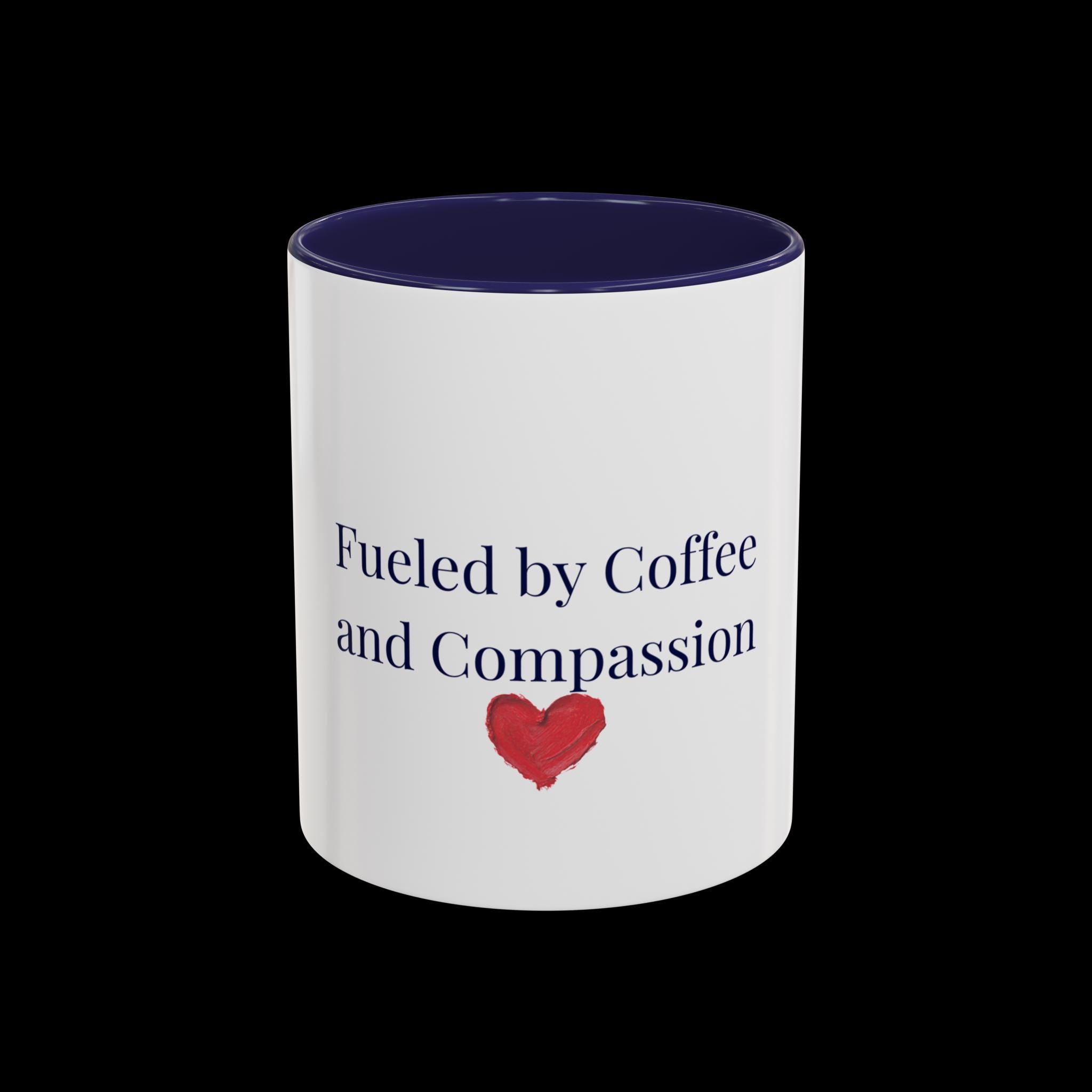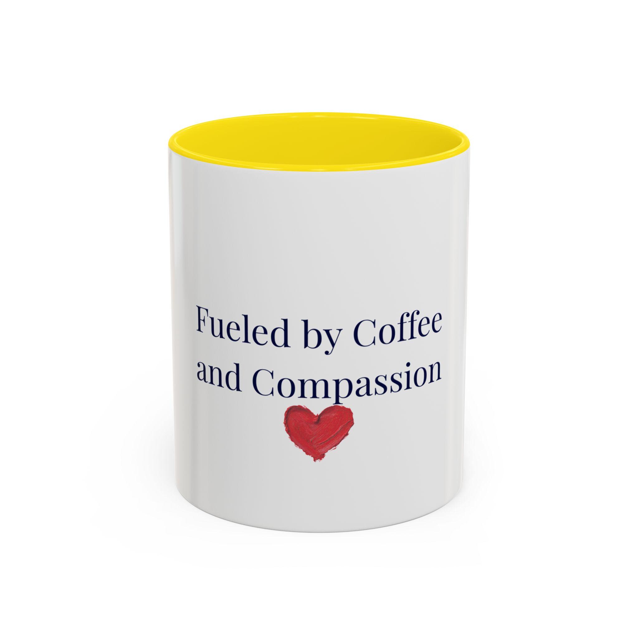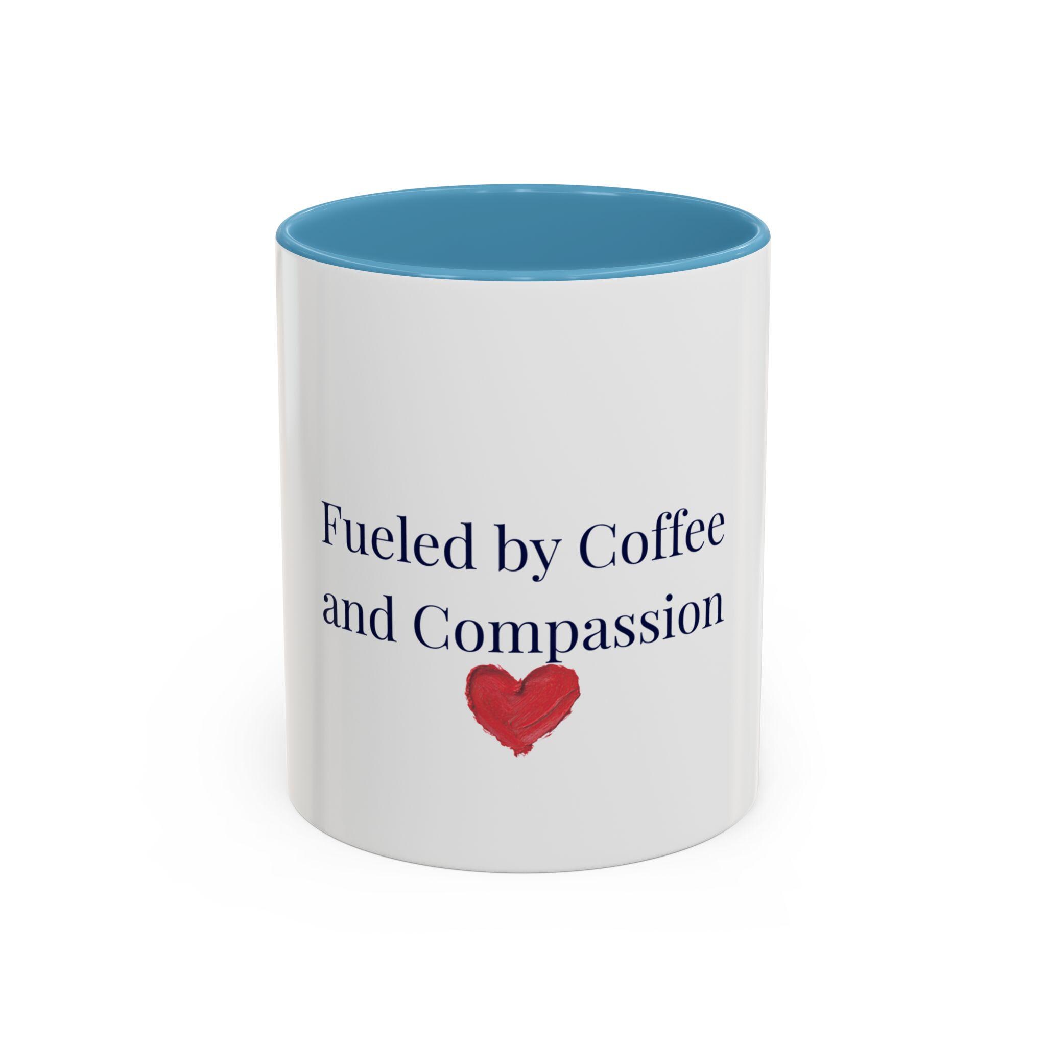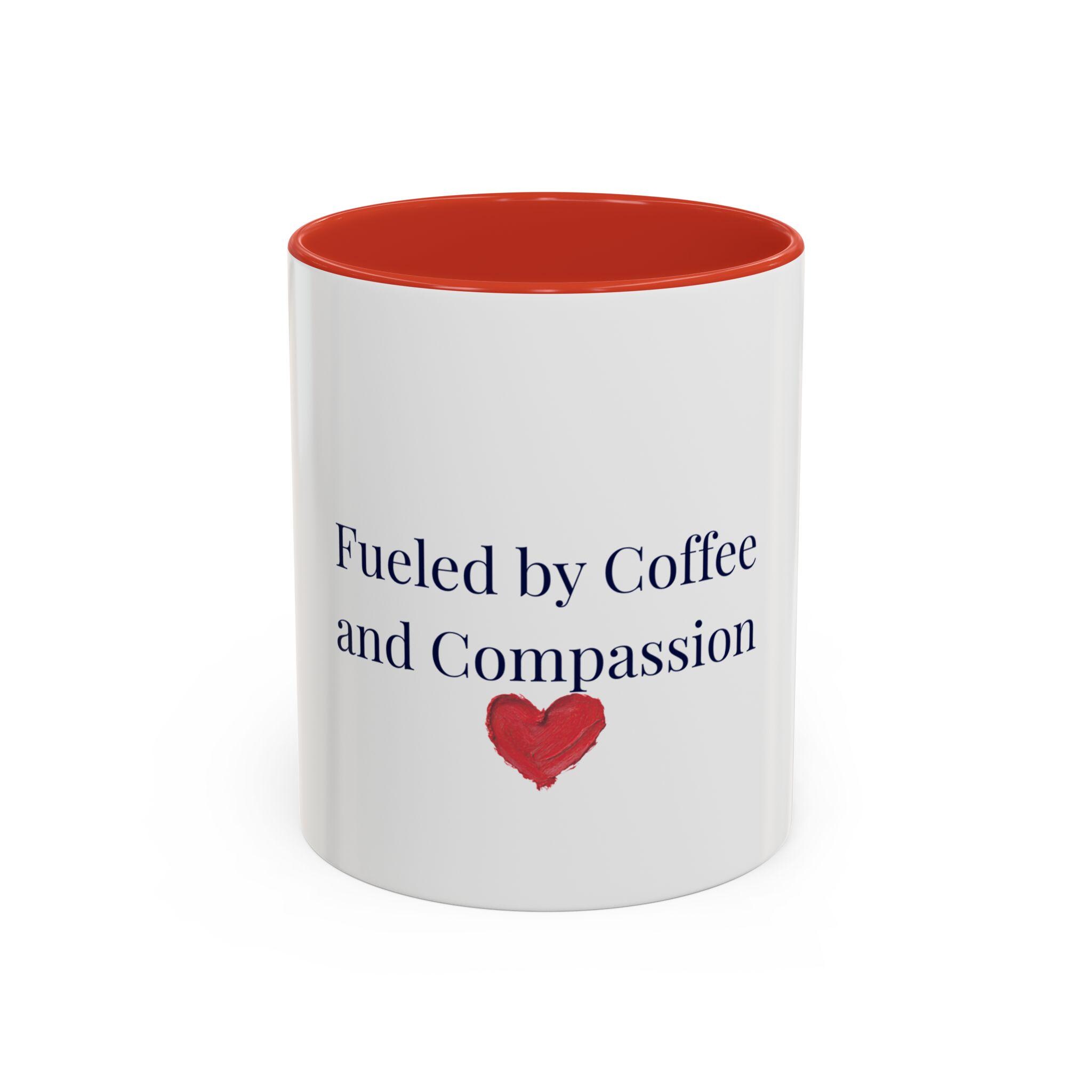 This glossy ceramic mug brings a gentle, human touch to your morning routine. The simple, heartfelt message — “Fueled by Coffee and Compassion” — sits above a small watercolor heart, pairing quiet kindness with the everyday ritual of coffee. The colored interior and handle add a subtle pop that frames the text while the white exterior keeps the design clean and readable. It’s sturdy enough for daily use: microwave- and dishwasher-safe, lead- and BPA-free, and offered in two sizes so you can choose the right pour for your day. Hold it in your hand and let a small reminder of warmth steer your busy mornings or low-key afternoons.