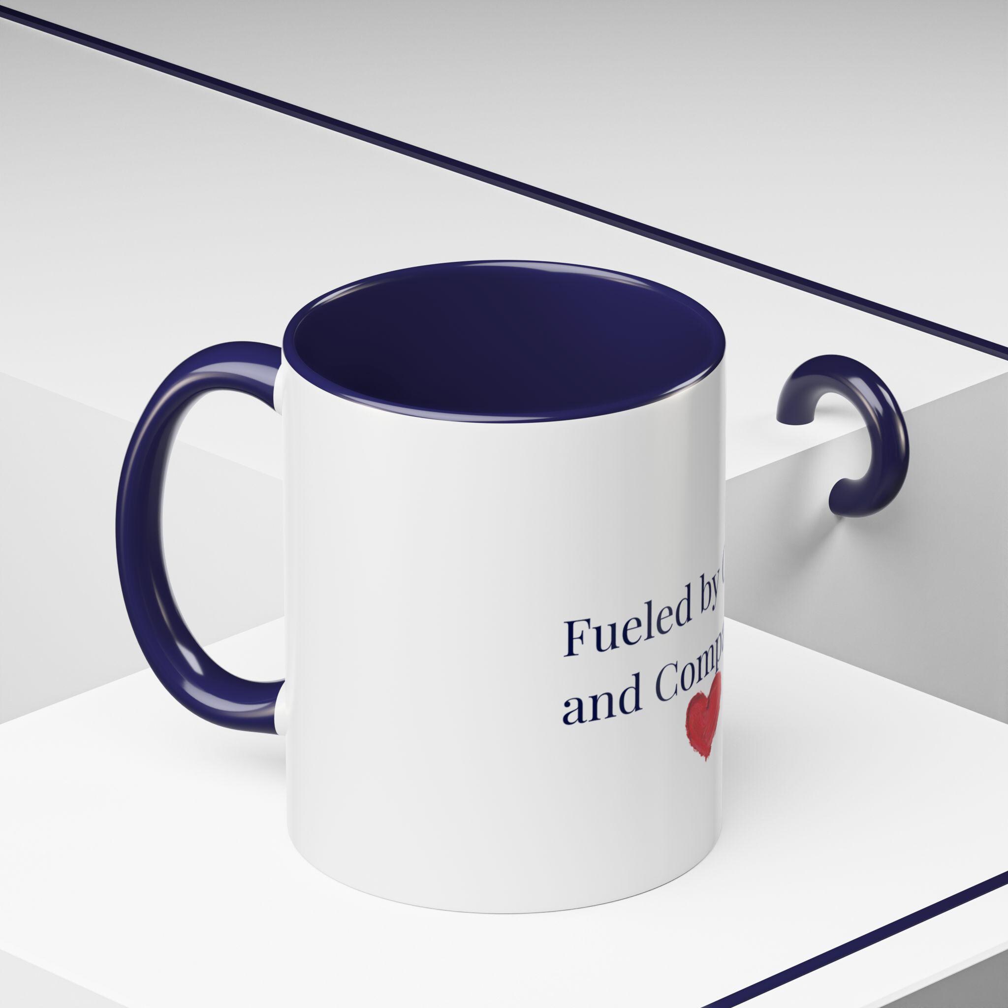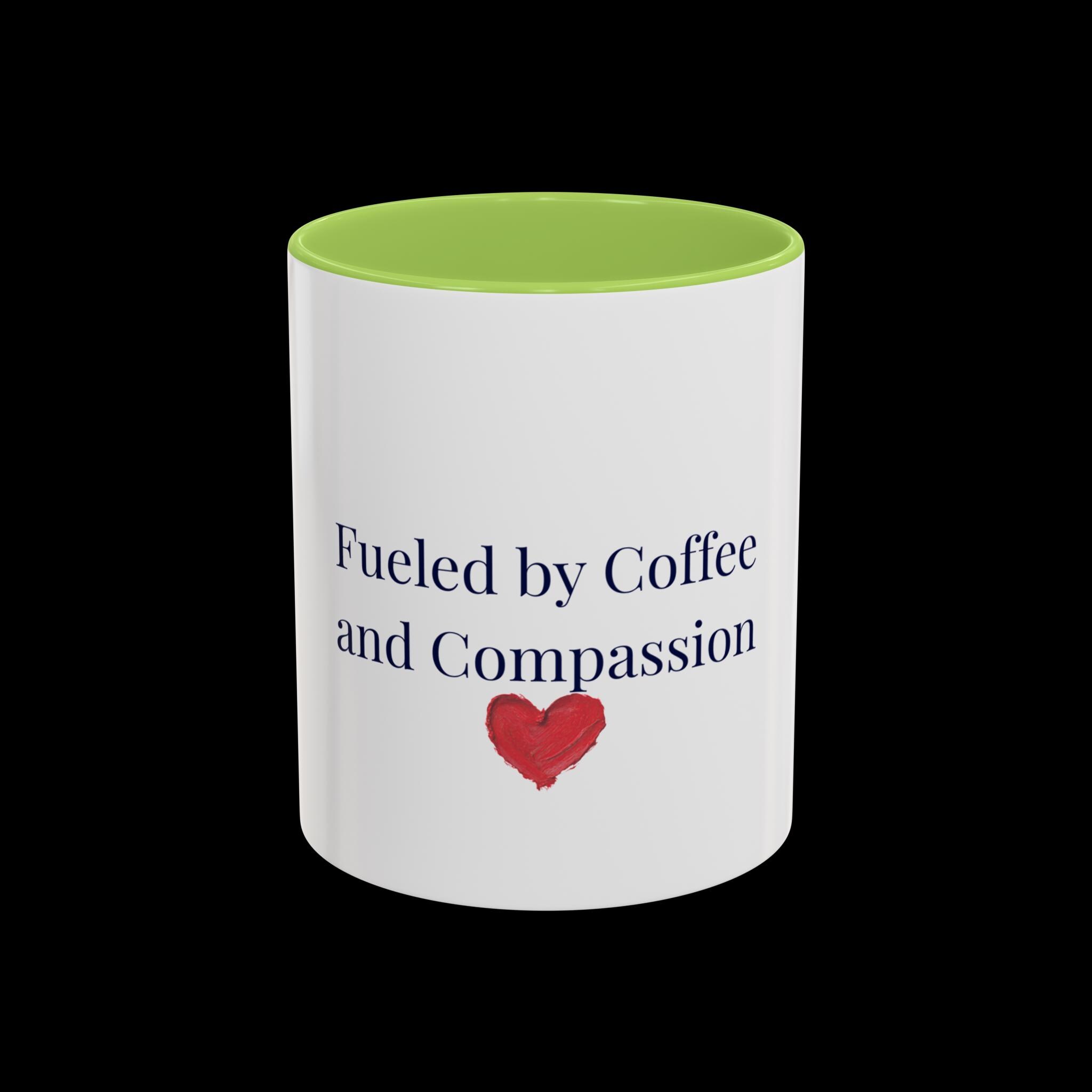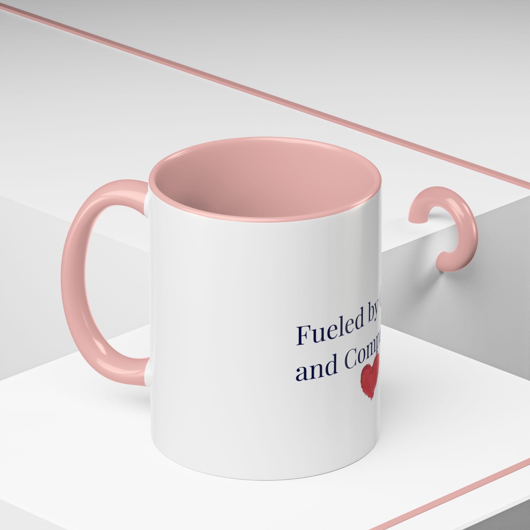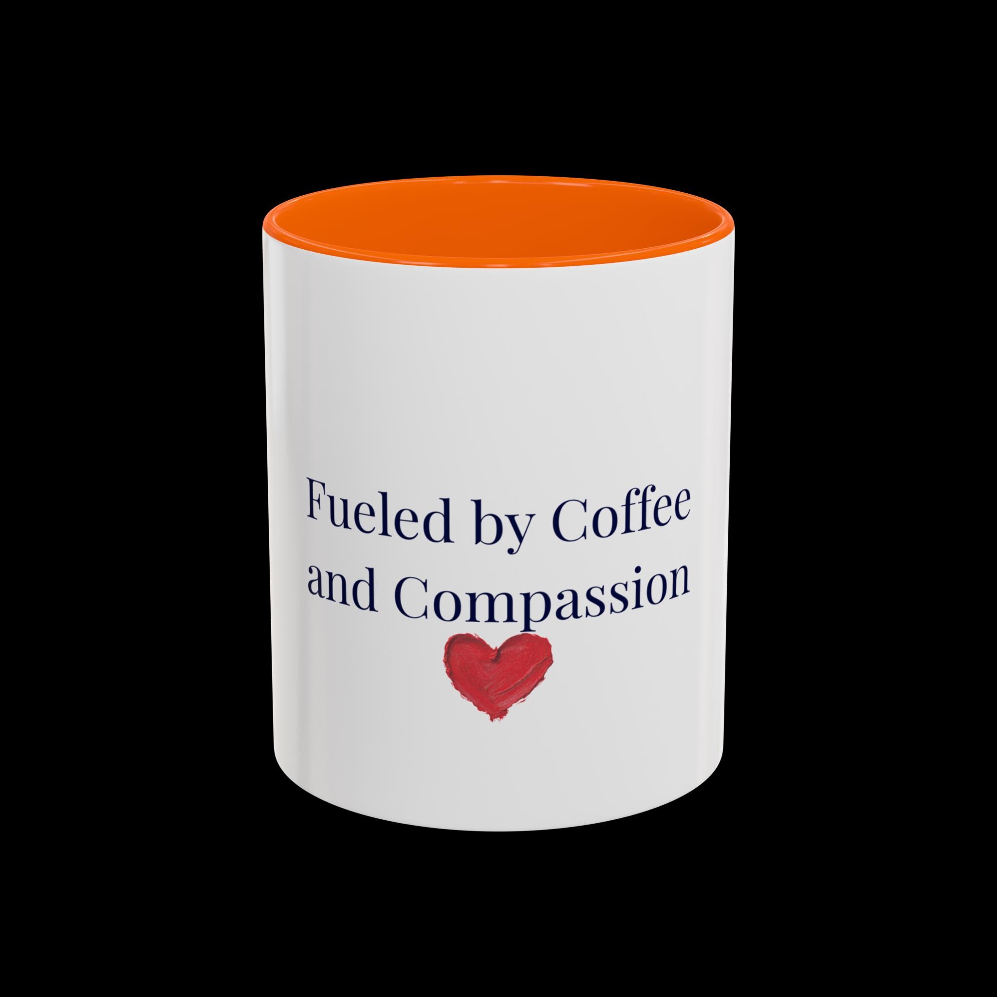 This glossy ceramic mug brings a gentle, human touch to your morning routine. The simple, heartfelt message — “Fueled by Coffee and Compassion” — sits above a small watercolor heart, pairing quiet kindness with the everyday ritual of coffee. The colored interior and handle add a subtle pop that frames the text while the white exterior keeps the design clean and readable. It’s sturdy enough for daily use: microwave- and dishwasher-safe, lead- and BPA-free, and offered in two sizes so you can choose the right pour for your day. Hold it in your hand and let a small reminder of warmth steer your busy mornings or low-key afternoons.