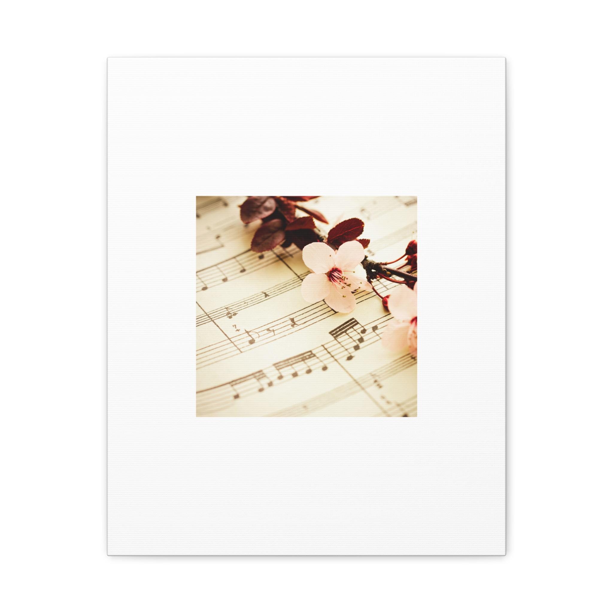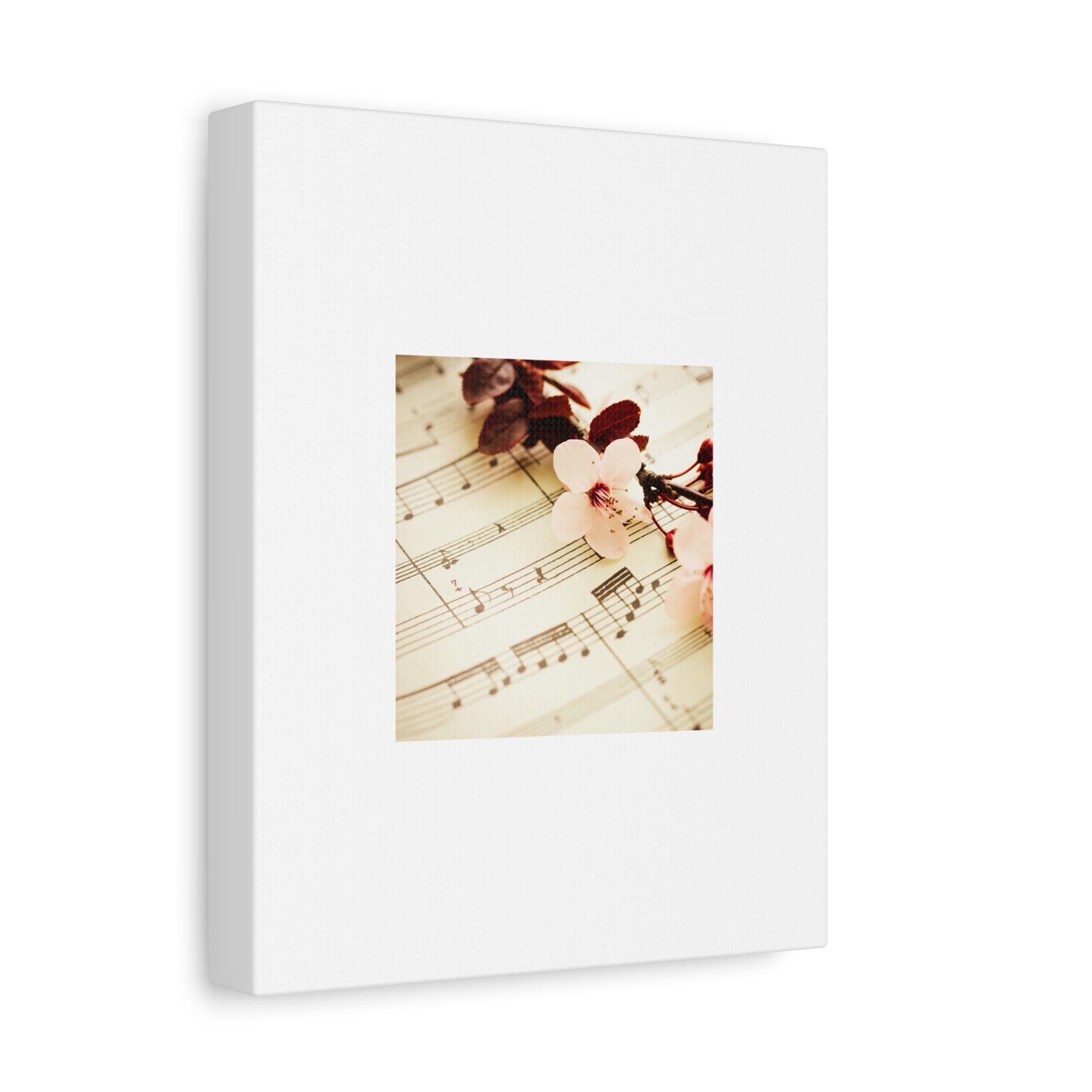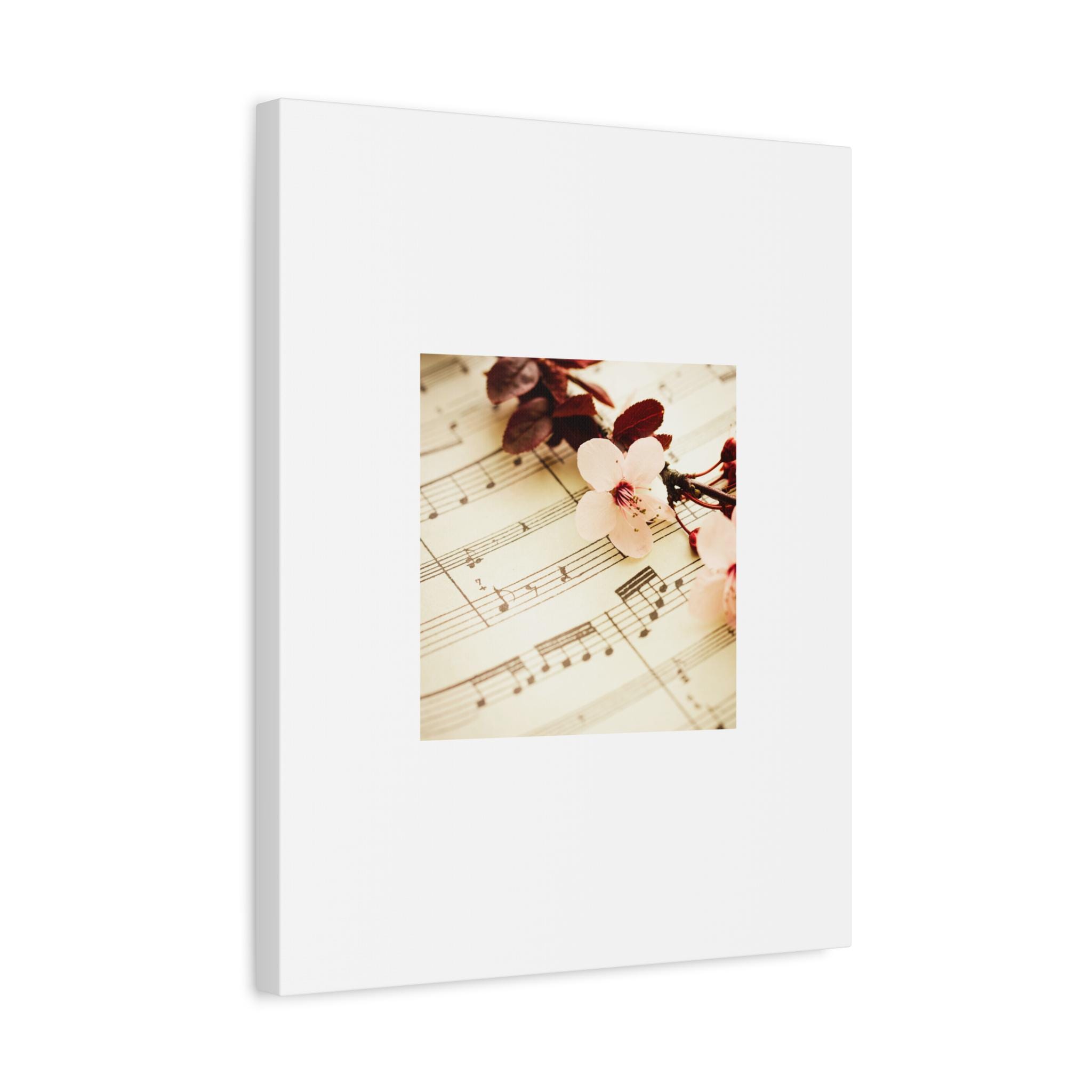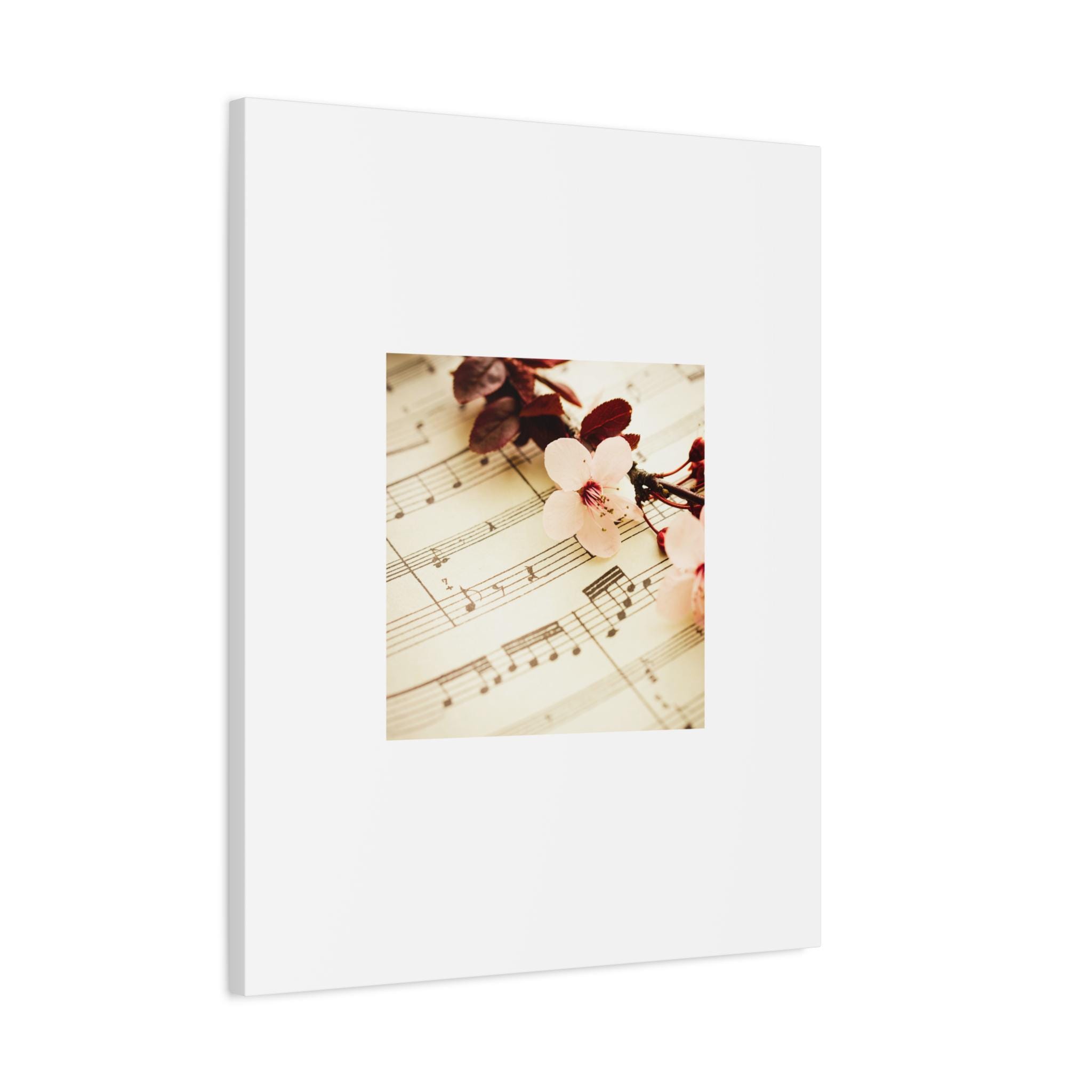 A soft, museum-style matte canvas print that brings quiet nostalgia to any room. The gentle sheet music and cherry blossom image sits framed by generous white space, creating a calm focal point that invites lingering. Printed with UL-certified Greenguard Gold inks on a cotton-poly canvas, the image retains subtle tones and a delicate vintage glow. The stretched pine frame gives the piece a light, natural edge while rubber pads protect surfaces and keep it level when hung. Choose from multiple orientations and sizes to suit reading nooks, music rooms, or serene bedrooms — the canvas reads like a small, intimate moment captured on the wall.