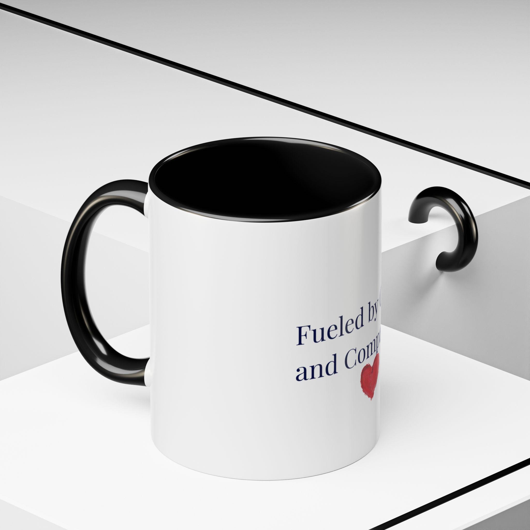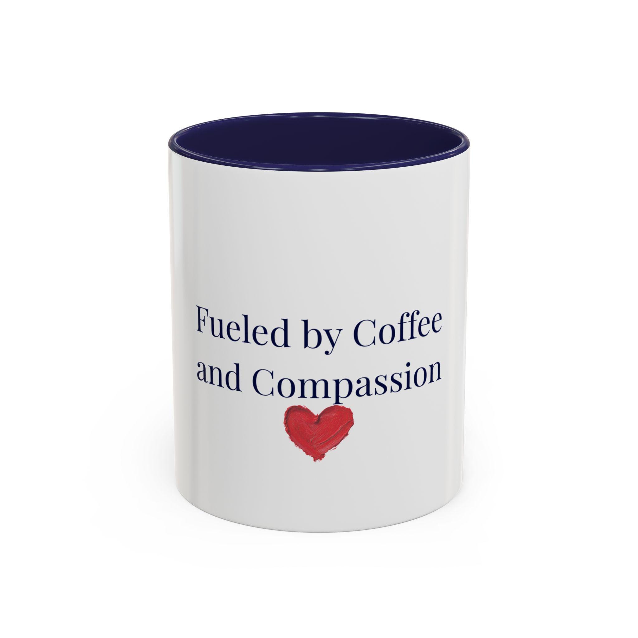 This glossy ceramic mug brings a gentle, human touch to your morning routine. The simple, heartfelt message — “Fueled by Coffee and Compassion” — sits above a small watercolor heart, pairing quiet kindness with the everyday ritual of coffee. The colored interior and handle add a subtle pop that frames the text while the white exterior keeps the design clean and readable. It’s sturdy enough for daily use: microwave- and dishwasher-safe, lead- and BPA-free, and offered in two sizes so you can choose the right pour for your day. Hold it in your hand and let a small reminder of warmth steer your busy mornings or low-key afternoons.